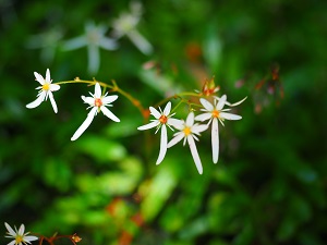 標高1000m以上の湿った岩上に生育していて、屋久島以外の地に生育するウチワダイモンジソウがものすごく小さくなった矮小品種。10月になると、沢沿いに咲いている。大の文字に似てますね。