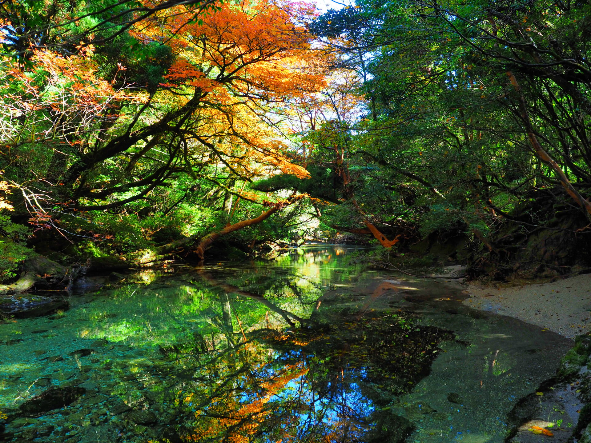 鏡のような澄んだ淀川に、コハウチワカエデの紅葉が美しく映り込む絶景